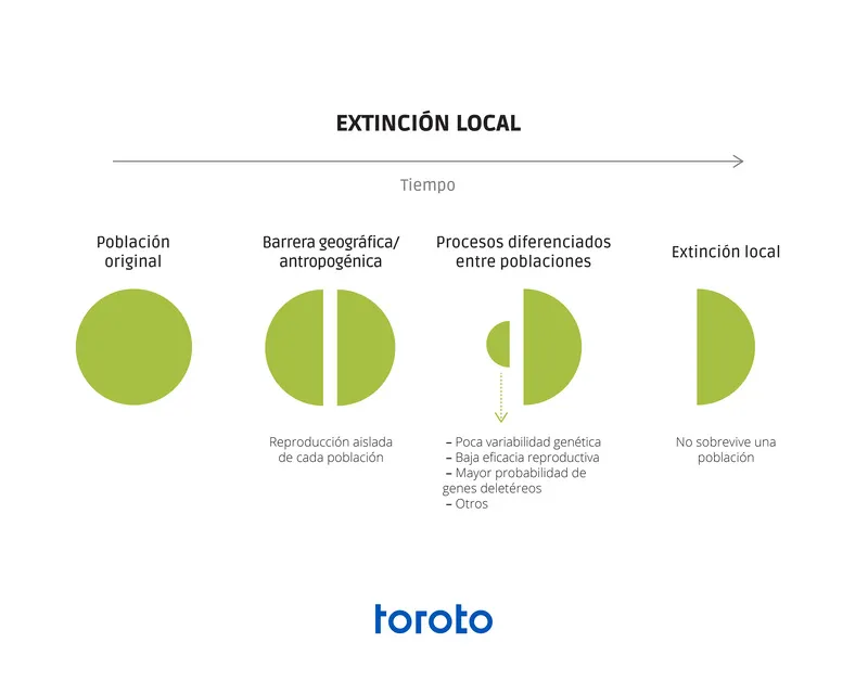 Por otro lado, la inferencia de la conectividad -o no- de una reserva con respecto a otra es fundamental para entender si el aislamiento de una población nos llevará a un proceso de estabilidad genética, especiación -formación de nuevas especies- o extinción local -desaparición permanente de una especie en la localidad- ya que resulta probable que si existe otra área conservada cercana, esta especie en cuestión pueda trasladarse y posiblemente encontrar una pareja reproductiva que no se haya reproducido con alguien de su población original anteriormente. Si las reservas se encuentran a una distancia significativa entre ellas, y lo que las conecta es un territorio poco permeable o inhóspito (el paisaje está fragmentado), como sucede en un extenso campo de cultivo de soya cultivada con ayuda de agrotóxicos, posiblemente la especie hipotética no logre llegar a la otra reserva, e igualmente así suceda con sus familiares, hasta que en el mejor de los casos, la endogamia y consaguinidad vuelva a la población aislada incompatible reproductivamente entre sí; y en el peor de los casos, los lleve a la extinción local.