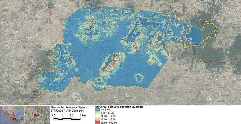 ¿Qué tan relacionados están estos dos procesos anteriores? Para estimar el impacto que tienen las actividades de infiltración de agua en la erosión del suelo, primero hicimos una evaluación del estado actual del recurso "suelo" en el valle. La Secretaría de Medio Ambiente y Recursos Naturales (SEMARNAT) (2013) y Bolaños et al. (2016) han publicado informes de erosión del suelo a nivel nacional. En estos documentos la erosión en Apan es considerada entre moderada y extrema. Además, Bolaños et al. (2016) reportan que al menos el 70% del paisaje hidalguense se encuentra afectado por erosión hídrica, mientras que SEMARNAT (2013) afirma que la erosión genera de 10 a 200 t/ha/año de sedimento dependiendo de la severidad de la degradación.