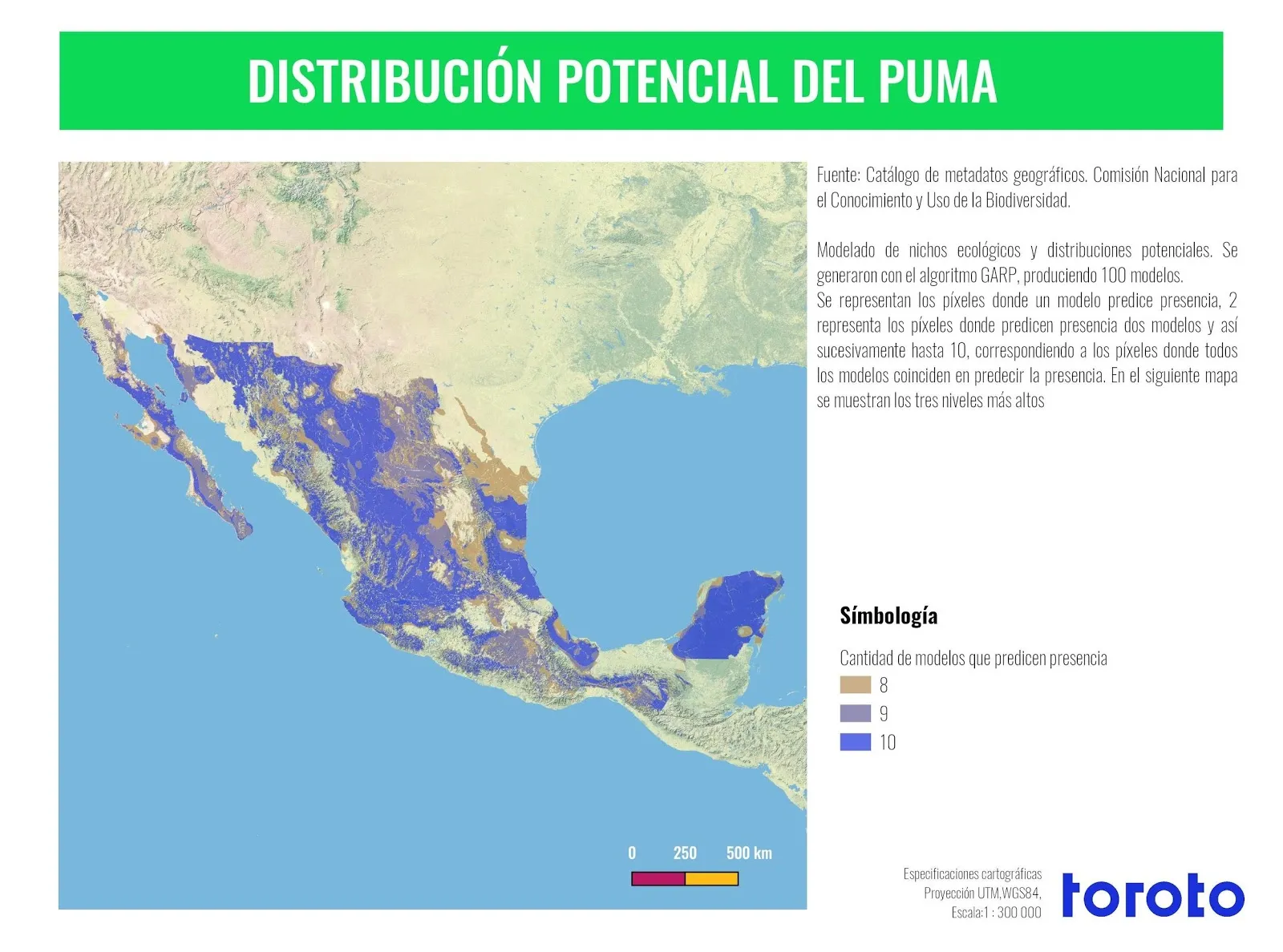 Geographic Location: The potential distribution of puma in the Baja California peninsula, 34% is included in Protected Natural Areas, 13% in Ramsar Sites and 9% in Priority Terrestrial Regions.