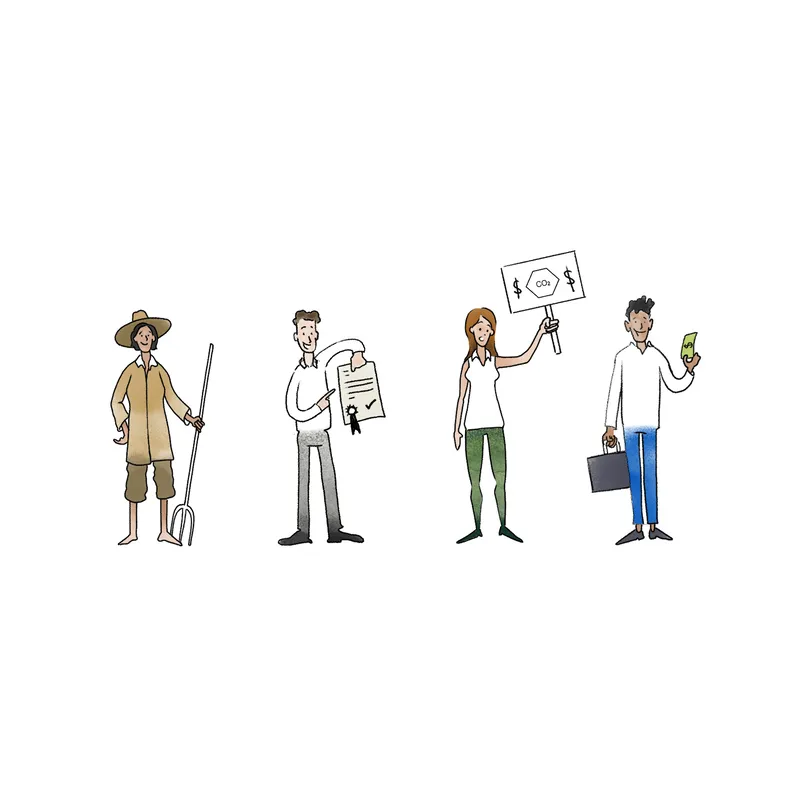 The voluntary carbon market is moderated by organizations that are responsible for verifying the integrity of the carbon credits generated. It results in a horizontal movement of services and products between companies. On the one hand, we have those we call 1. Project developers, either of forest carbon, from regenerative agriculture or any other existing modality, those who produce the bonds; likewise, we have 2. Certifiers and verifiers, who are responsible for ensuring that the integrity and quality of the project effectively meets the necessary standards; then there are 3. Brokers, Who makes the transaction Per se between companies; and finally, the 4. End customer, who will use the bonds to affirm their contribution to climate action as part of a climate strategy.