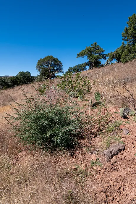 Plant species such as sabino (Juniperus deppeana), maguey (Agave spp.), nopal (Opuntia spp.), mesquite (Prosopis spp.) and huizache (Vachellia farnesiana); trees such as oak (Quercus spp.) and white cedar (Cupressus lusitanica); plants such as nolinas (Nolina spp.) and various shrub and herbal species.